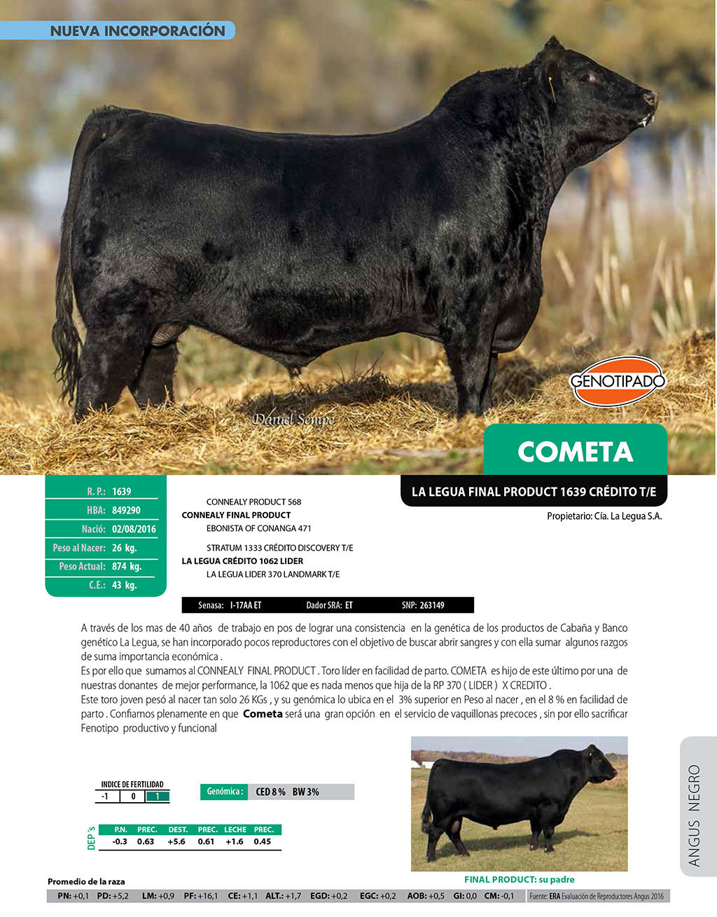 COMETA – RP 1639Deja un comentario / Por admindamianlalegua / septiembre 20, 2024 Gran toro padre de nuestro banco con la consitencia genética de sangres reconocidas. Su Genómica lo ubica en el 3% superior en la raza en peso al nacier y en el 8% superior en facilidad de parto.Compartir en redes: